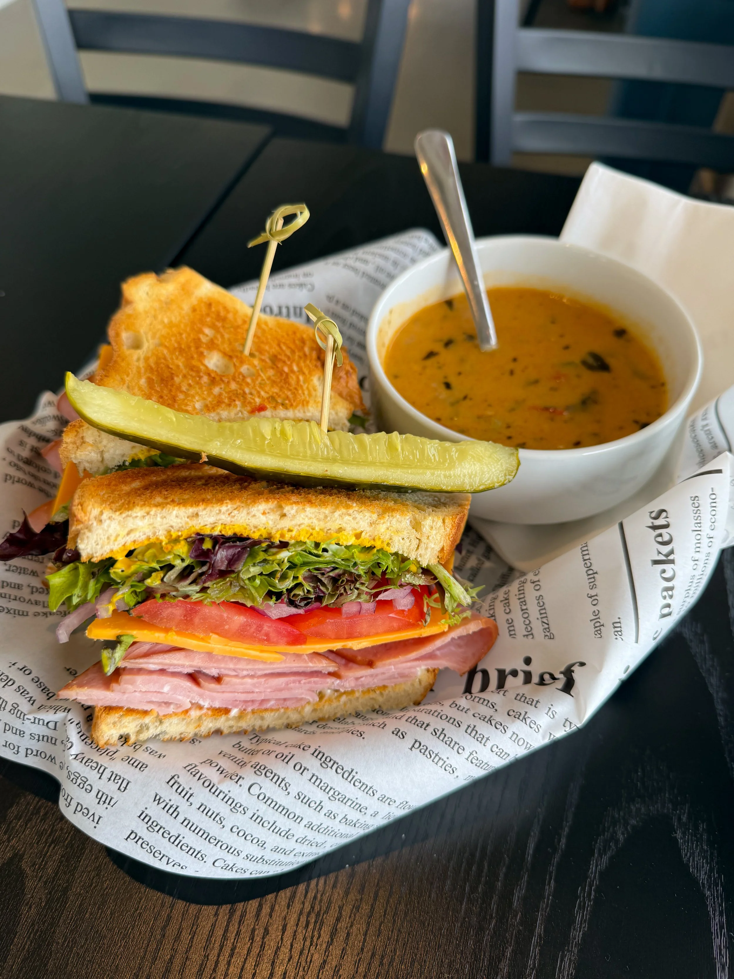 Ham, cheddar, lettuce, tomato, red onion, mustard & mayo on foccacia